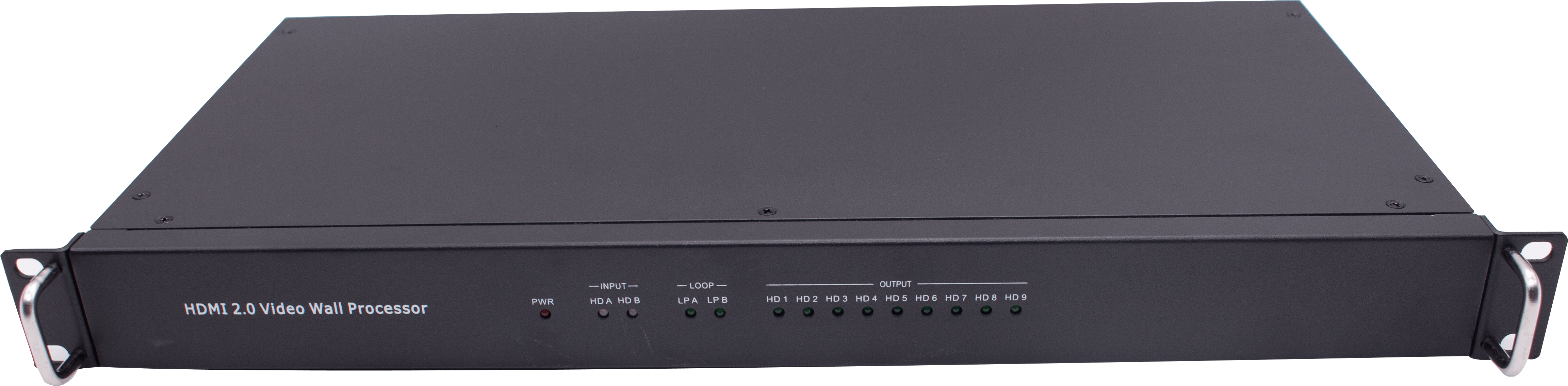 Acest produs este un controler de perete video HDMI 2.0 cu 2 intrări HDMI, 2 ieșiri bucle HDMI și 9 ieșiri de scalare HDMI pentru procesarea peretelui video. Terminalul mufă Toslink oferă sunet analogic L/R și ieșire audio digitală SPDIF. Jacheta Phoenix cu 5 pini oferă o ieșire audio echilibrată L/R. Produsul acceptă, de asemenea, funcția de bypass RS-232 pentru conexiunea în lanț și în cascadă între diferite unități.