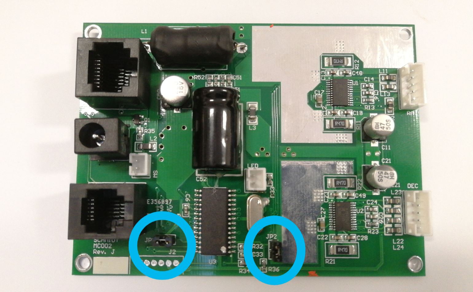 Electronică de control al motorului MC002, versiune fără USB (jumper JP1 și JP2 pentru EQ3 PRO GOTO / fără jumper pentru EQM-35 PRO GOTO / jumper JP2 pentru EQ5 PRO GOTO)