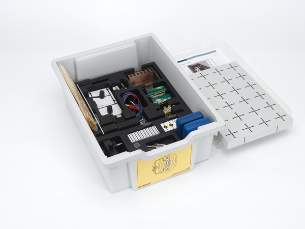 Set de echipamente pentru realizarea experimentelor de bază în electricitate, cum ar fi circuitul electric, legea lui Ohm, dioda, magnetul, inducția, conductivitatea și inducția electrostatică. În cutie de depozitare cu inserție din spumă, cu locașuri special modelate pentru aparate și capac.