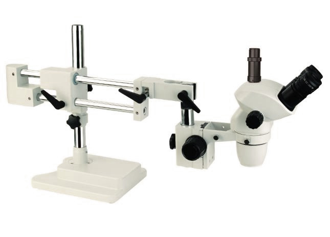 Microscop stereo cu zoom industrial pentru distanță lungă de lucru, cu stativ flexibil cu două brațe, mărire 7-45x, cap binocular sau trinocular (fototub).