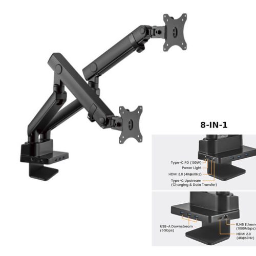 Suport 2 monitoare de masa cu Statie docking 8-in-1, Blackmount MNT20-2, 17″-32″, max.8 kg/brat, otel, negru