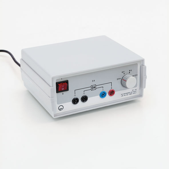 Power supply for experiments on electricity and simple electronics experiments. Output voltage adjustable in steps; overload-protected with bimetallic switch.