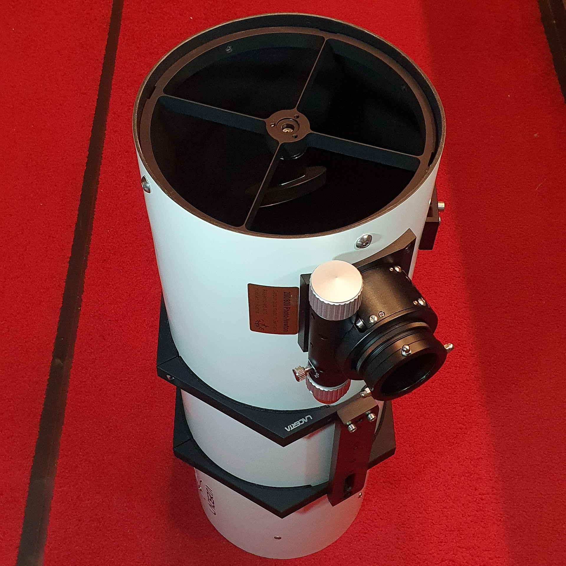 Construcție personalizată, tub de carbon cu structură sandwich, optică SkyWatcher selectată, suporturi de oglindă personalizate, interior extra mat, focalizator OctoPlus de 2″ cu 8 rulmenți
